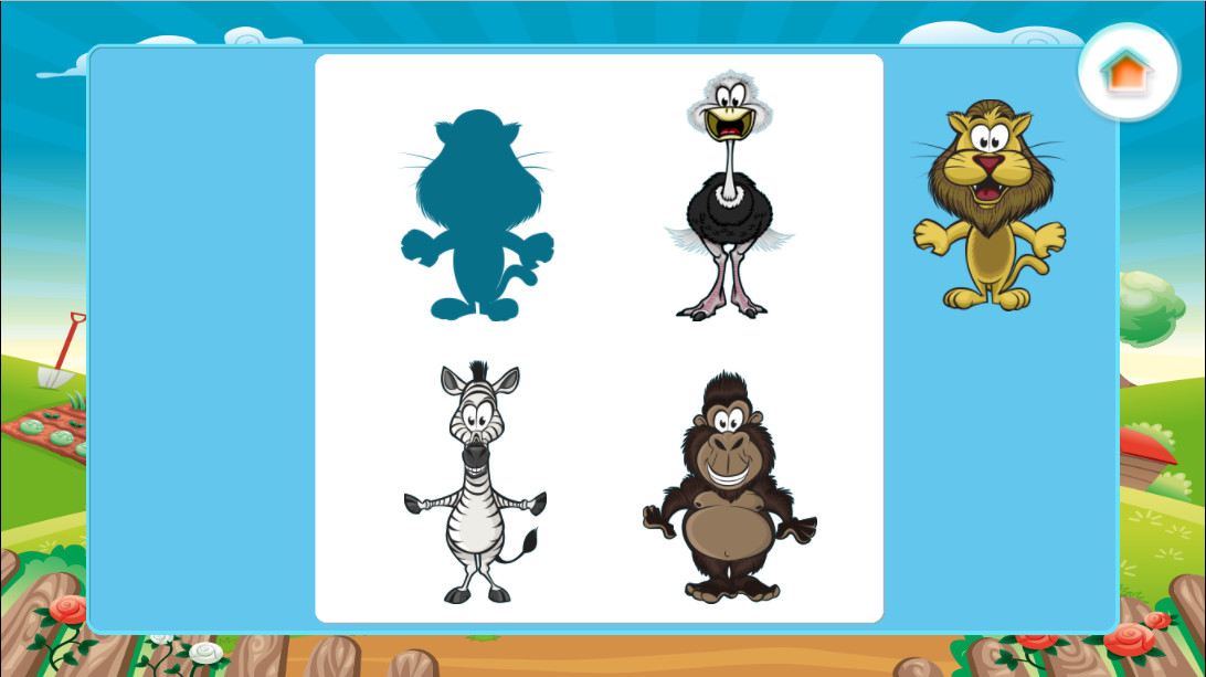 | В этой игре вам даны четыре животных и четыре очертания этих животных, и вам нужно сопоставить животное и соответствующее очертание. Каждый раз, когда вы правильно это делаете, вы выиграете уровень. Геймплей, графика и музыкальное сопровождение – все сделано специально для детей, чтобы им было интересно, так как у игры есть еще образовательная задача. |