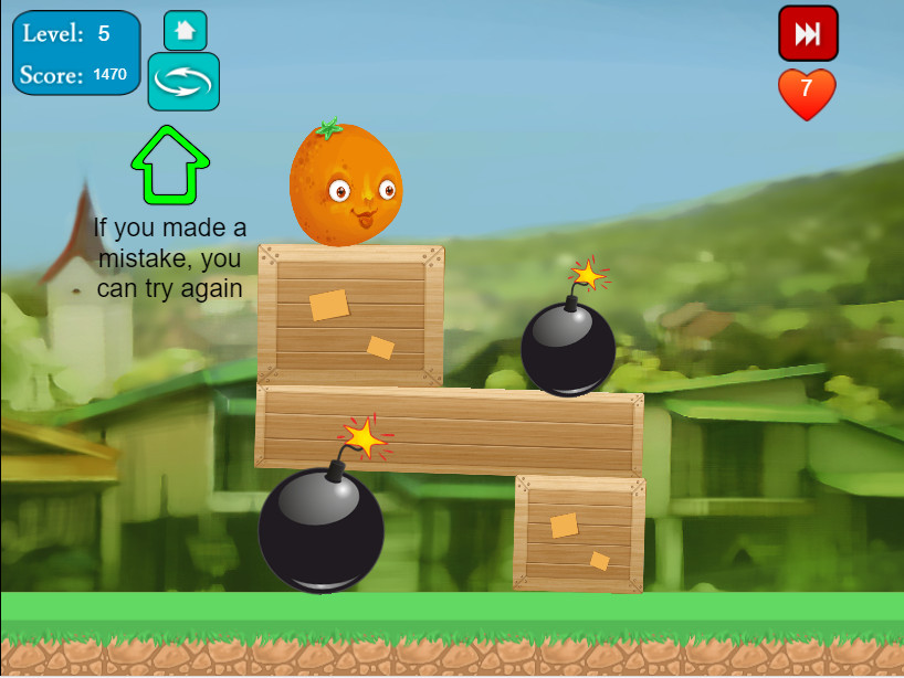 | Главный герой игры апельсин, он стоит на коробках и платформах. Он очень боится высоты, поэтому вы должны помочь ему добраться до земли, убрав эти коробки и платформы. Но будьте осторожны, с каждым уровнем могут появляться новые опасные предметы (бомбы и кактусы), если апельсин прикоснётся к ним, вы потеряете одну жизнь! Вначале вам дается 5 жизней, также вы можете заработать дополнительные жизни в игре. Всего в игре 20 уровней, постарайтесь пройти их все и заработать много очков! |