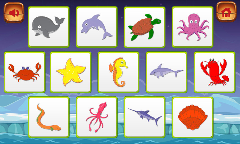 Это детская игра о морских жителях может быть очень полезна в обучении маленьких детей и тренировке памяти. В этой игре 4 режима: Обучение – в этом режиме можно посмотреть все карточки и можно нажимать на них, чтобы прослушать название