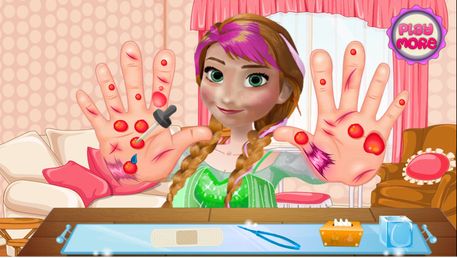 Принцесса была очень неаккуратно и упала, поранив себе ладони. Вам придется их обработать. В вашем распоряжении есть пинцет, салфетки, пластыри, вода, перекись водорода и с их помощью вы должны вытащить все занозы, очистить раны, обеззаразить их и заклеить пластырем.