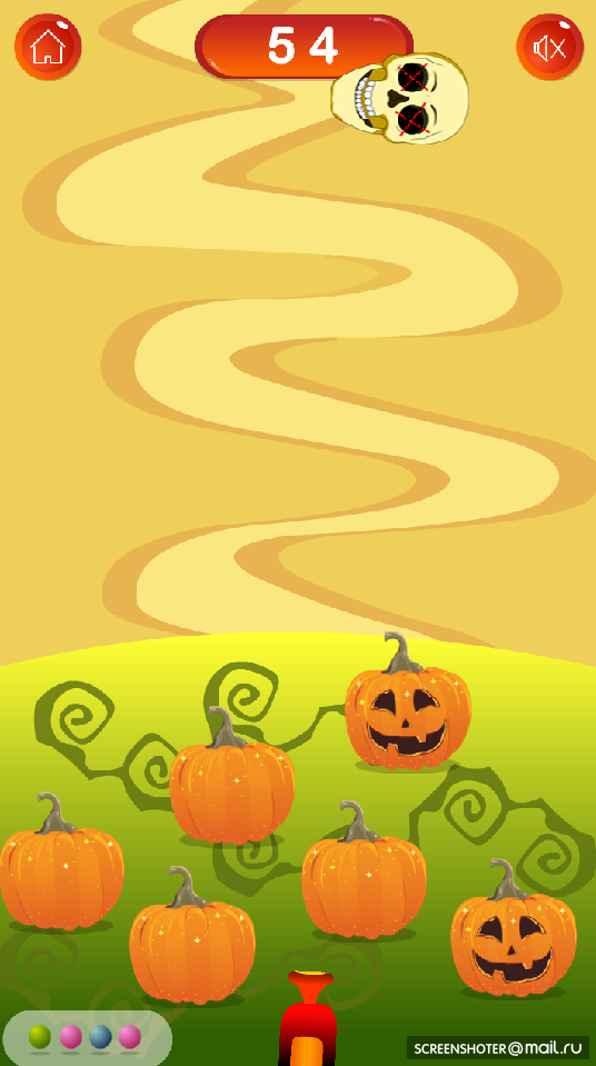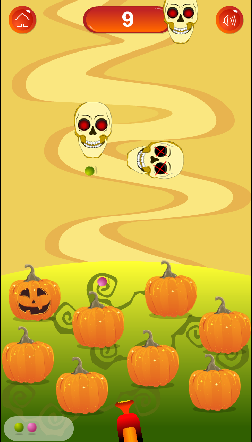 Если вам нравится тематика хеллоуина то эта игра для вас. Здесь вам предстоит защитить тыквы от одержимых черепов. Простое управление, нужно лишь выстрелить из пушки, нажав на экран, в нужном направлении.